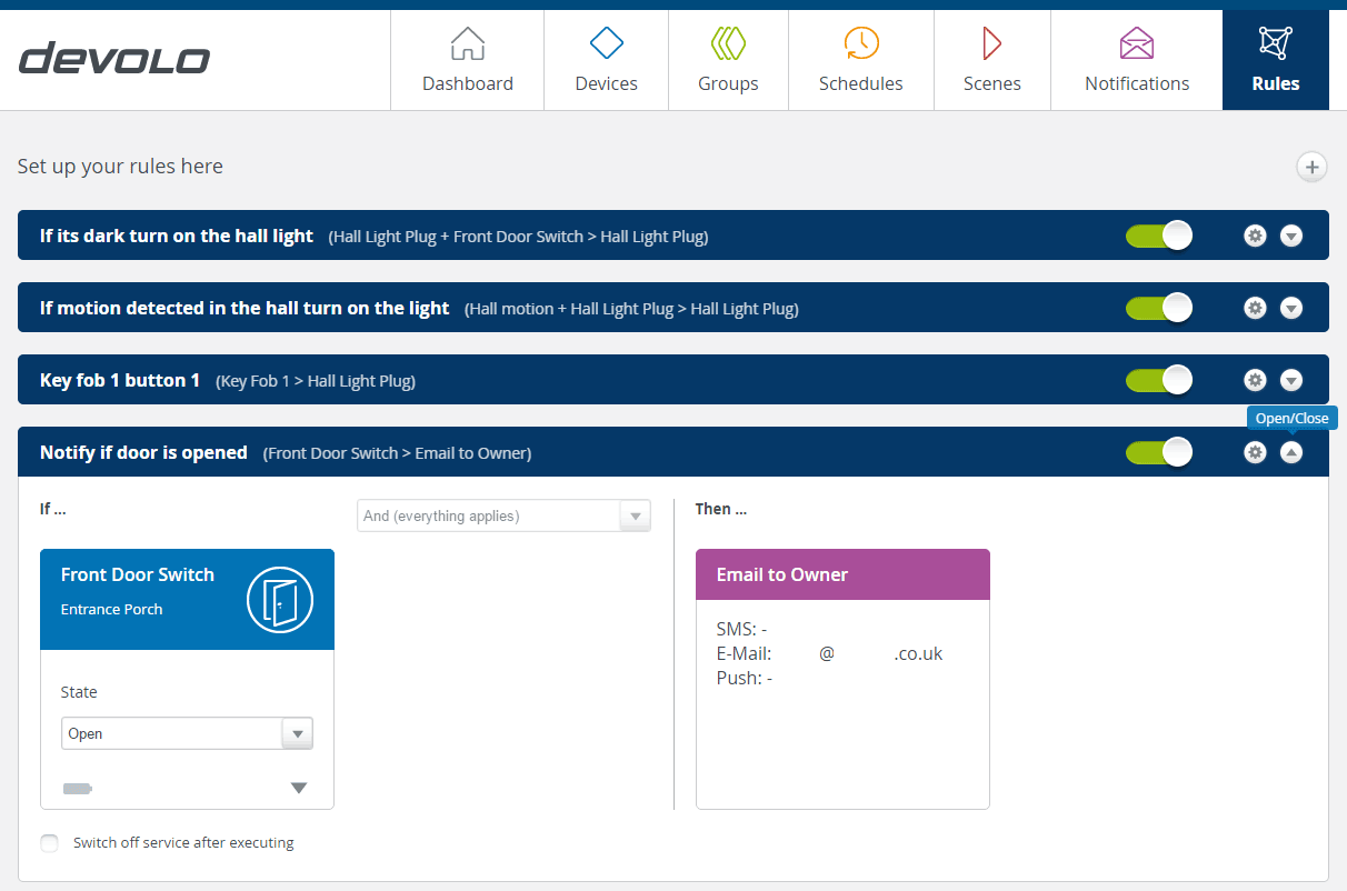 Once a notification is setup you next go to rules and setup a rule to trigger a notification, for example email the property owner when the front door is opened.