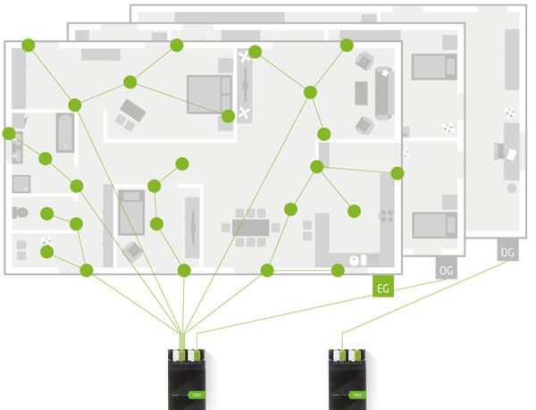 Loxone Tree is a free form wiring standard that allows you to run a single cable to each floor, room or area of your home from the Miniserver to the Tree Extension.