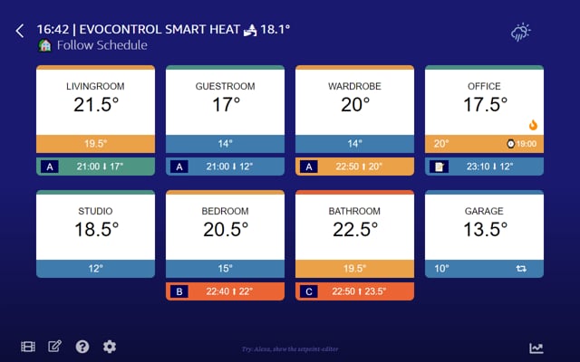 I've created a new Alexa skill called EvoControl Smart Heat for controlling Evohome. Being a custom skill, it does a lot that the standard Resideo (smart-home) skill cannot do, extending Evohome with non-native capabilities like multiple schedules, schedule-shifting (advance/delay), groups, and an activity/scene paradigm. Because it's multimodal, you get to choose whether to use voice control and/or touch-inputs on Echos with screens.
